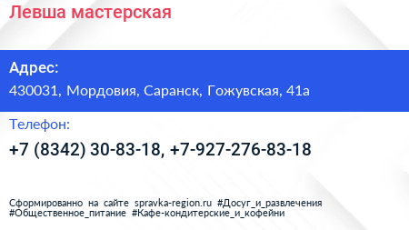 Левша, мастерская по адресу 430031, Мордовия, Саранск, Гожувская, 41а в дальнейшем Организация, размещена в следующих категориях: