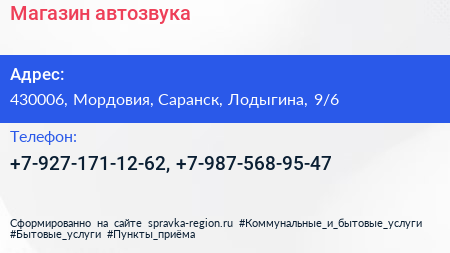Магазин автозвука по адресу 430006, Мордовия, Саранск, Лодыгина, 9/6 в дальнейшем Организация, размещена в следующих категориях: