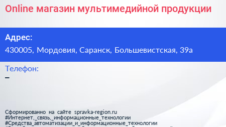 Online, магазин мультимедийной продукции по адресу 430005, Мордовия, Саранск, Большевистская, 39а в дальнейшем Организация, размещена в следующих категориях: