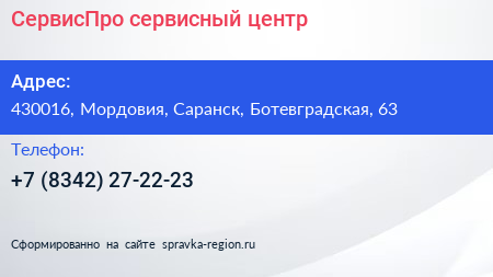 СервисПро, сервисный центр по адресу 430016, Мордовия, Саранск, Ботевградская, 63 в дальнейшем Организация, размещена в следующих категориях: