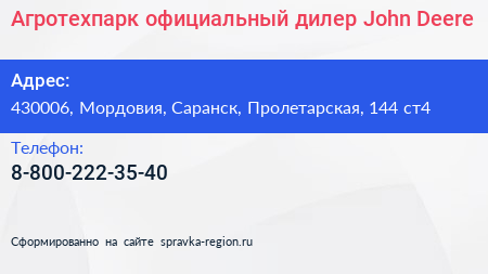 Агротехпарк, официальный дилер John Deere по адресу 430006, Мордовия, Саранск, Пролетарская, 144 ст4 в дальнейшем Организация, размещена в следующих категориях: