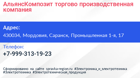 АльянсКомпозит, торгово-производственная компания по адресу 430034, Мордовия, Саранск, Промышленная 1-я, 17 в дальнейшем Организация, размещена в следующих категориях: