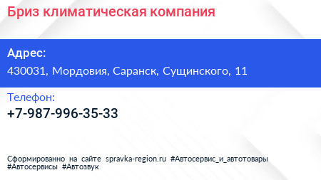 Бриз, климатическая компания по адресу 430031, Мордовия, Саранск, Сущинского, 11 в дальнейшем Организация, размещена в следующих категориях: