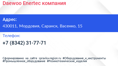 Daewoo Enertec, компания по адресу 430011, Мордовия, Саранск, Васенко, 15 в дальнейшем Организация, размещена в следующих категориях: