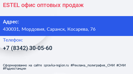 ESTEL, офис оптовых продаж по адресу 430031, Мордовия, Саранск, Косарева, 76 в дальнейшем Организация, размещена в следующих категориях: