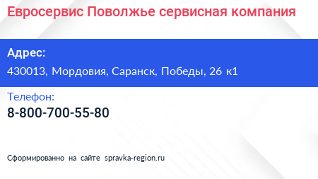 Евросервис-Поволжье, сервисная компания по адресу 430013, Мордовия, Саранск, Победы, 26 к1 в дальнейшем Организация, размещена в следующих категориях: