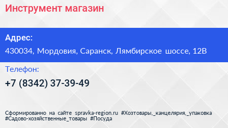 Инструмент, магазин по адресу 430034, Мордовия, Саранск, Лямбирское шоссе, 12В в дальнейшем Организация, размещена в следующих категориях: