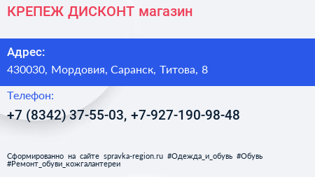 КРЕПЕЖ-ДИСКОНТ, магазин по адресу 430030, Мордовия, Саранск, Титова, 8 в дальнейшем Организация, размещена в следующих категориях: