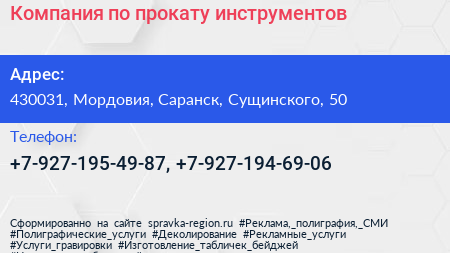 Компания по прокату инструментов по адресу 430031, Мордовия, Саранск, Сущинского, 50 в дальнейшем Организация, размещена в следующих категориях: