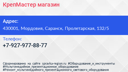КрепМастер, магазин по адресу 430001, Мордовия, Саранск, Пролетарская, 132/5 в дальнейшем Организация, размещена в следующих категориях: