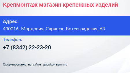 Крепмонтаж, магазин крепежных изделий по адресу 430016, Мордовия, Саранск, Ботевградская, 63 в дальнейшем Организация, размещена в следующих категориях: