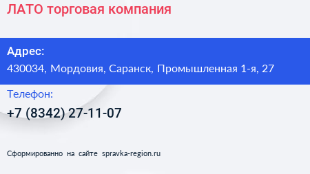 ЛАТО, торговая компания по адресу 430034, Мордовия, Саранск, Промышленная 1-я, 27 в дальнейшем Организация, размещена в следующих категориях: