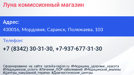 Луна, комиссионный магазин по адресу 430016, Мордовия, Саранск, Полежаева, 103 в дальнейшем Организация, размещена в следующих категориях: