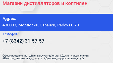 Магазин дистилляторов и коптилен по адресу 430003, Мордовия, Саранск, Рабочая, 70 в дальнейшем Организация, размещена в следующих категориях: