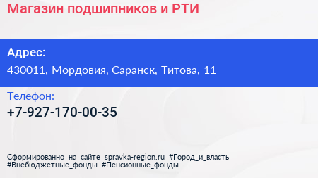 Магазин подшипников и РТИ по адресу 430011, Мордовия, Саранск, Титова, 11 в дальнейшем Организация, размещена в следующих категориях: