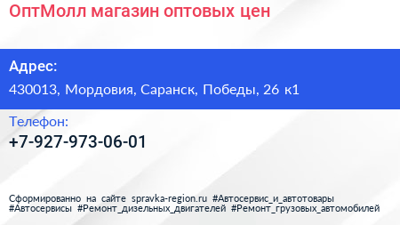 ОптМолл, магазин оптовых цен по адресу 430013, Мордовия, Саранск, Победы, 26 к1 в дальнейшем Организация, размещена в следующих категориях: