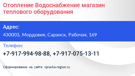 Отопление-Водоснабжение, магазин теплового оборудования по адресу 430003, Мордовия, Саранск, Рабочая, 169 в дальнейшем Организация, размещена в следующих категориях: