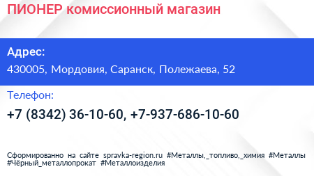 ПИОНЕР, комиссионный магазин по адресу 430005, Мордовия, Саранск, Полежаева, 52 в дальнейшем Организация, размещена в следующих категориях: