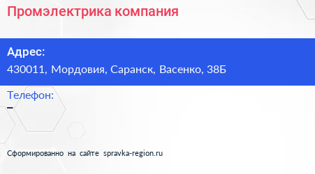 Промэлектрика, компания по адресу 430011, Мордовия, Саранск, Васенко, 38Б в дальнейшем Организация, размещена в следующих категориях: