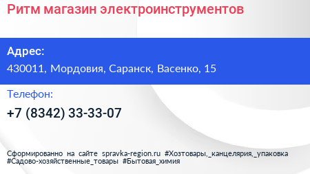 Ритм, магазин электроинструментов по адресу 430011, Мордовия, Саранск, Васенко, 15 в дальнейшем Организация, размещена в следующих категориях:
