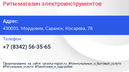 Ритм, магазин электроинструментов по адресу 430031, Мордовия, Саранск, Косарева, 78 в дальнейшем Организация, размещена в следующих категориях: