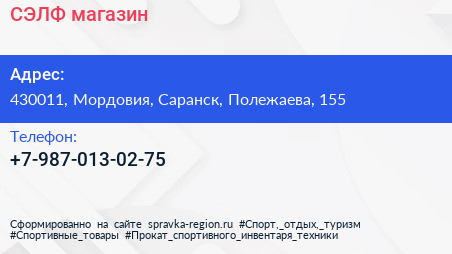 СЭЛФ, магазин по адресу 430011, Мордовия, Саранск, Полежаева, 155 в дальнейшем Организация, размещена в следующих категориях: