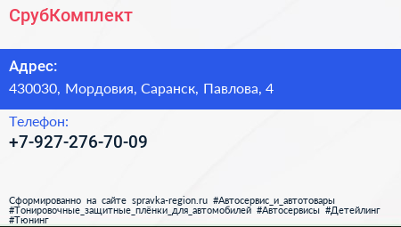 СрубКомплект по адресу 430030, Мордовия, Саранск, Павлова, 4 в дальнейшем Организация, размещена в следующих категориях: