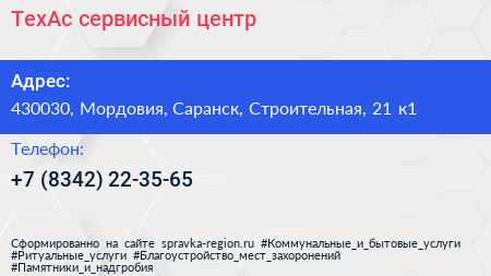 ТехАс, сервисный центр по адресу 430030, Мордовия, Саранск, Строительная, 21 к1 в дальнейшем Организация, размещена в следующих категориях: