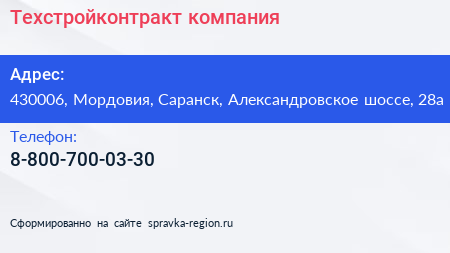Техстройконтракт, компания по адресу 430006, Мордовия, Саранск, Александровское шоссе, 28а в дальнейшем Организация, размещена в следующих категориях: