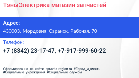 ТэныЭлектрика, магазин запчастей по адресу 430003, Мордовия, Саранск, Рабочая, 70 в дальнейшем Организация, размещена в следующих категориях: