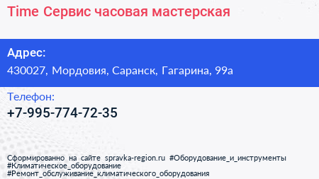 Time Сервис, часовая мастерская по адресу 430027, Мордовия, Саранск, Гагарина, 99а в дальнейшем Организация, размещена в следующих категориях: