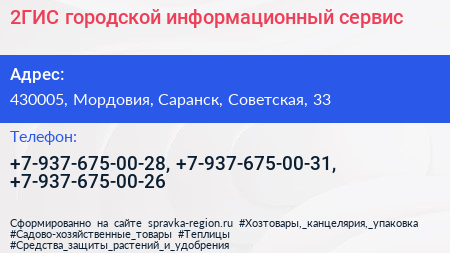 2ГИС, городской информационный сервис по адресу 430005, Мордовия, Саранск, Советская, 33 в дальнейшем Организация, размещена в следующих категориях: