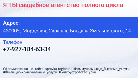 Я+ТЫ, свадебное агентство полного цикла по адресу 430005, Мордовия, Саранск, Богдана Хмельницкого, 14 в дальнейшем Организация, размещена в следующих категориях:
