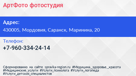 АртФото, фотостудия по адресу 430005, Мордовия, Саранск, Маринина, 20 в дальнейшем Организация, размещена в следующих категориях: