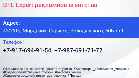 BTL Expert, рекламное агентство по адресу 430005, Мордовия, Саранск, Володарского, 60Б ст1 в дальнейшем Организация, размещена в следующих категориях: