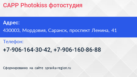 CAPP Photokiss, фотостудия по адресу 430003, Мордовия, Саранск, проспект Ленина, 41 в дальнейшем Организация, размещена в следующих категориях:
