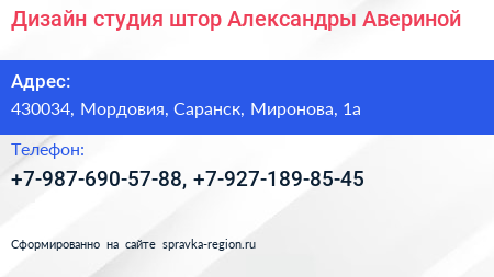 Дизайн-студия штор Александры Авериной по адресу 430034, Мордовия, Саранск, Миронова, 1а в дальнейшем Организация, размещена в следующих категориях: