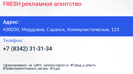 FRESH, рекламное агентство по адресу 430030, Мордовия, Саранск, Коммунистическая, 123 в дальнейшем Организация, размещена в следующих категориях: