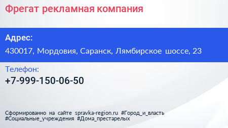 Фрегат, рекламная компания по адресу 430017, Мордовия, Саранск, Лямбирское шоссе, 23 в дальнейшем Организация, размещена в следующих категориях: