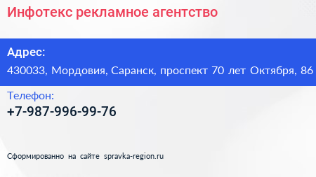 Инфотекс, рекламное агентство по адресу 430033, Мордовия, Саранск, проспект 70 лет Октября, 86 в дальнейшем Организация, размещена в следующих категориях:
