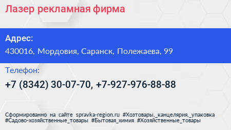 Лазер, рекламная фирма по адресу 430016, Мордовия, Саранск, Полежаева, 99 в дальнейшем Организация, размещена в следующих категориях: