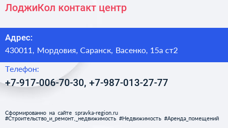 ЛоджиКол, контакт-центр по адресу 430011, Мордовия, Саранск, Васенко, 15а ст2 в дальнейшем Организация, размещена в следующих категориях: