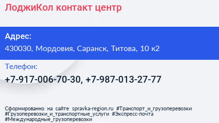 ЛоджиКол, контакт-центр по адресу 430030, Мордовия, Саранск, Титова, 10 к2 в дальнейшем Организация, размещена в следующих категориях: