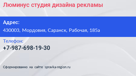Люминус, студия дизайна рекламы по адресу 430003, Мордовия, Саранск, Рабочая, 185а в дальнейшем Организация, размещена в следующих категориях: