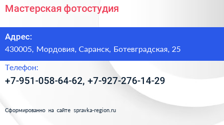 Мастерская, фотостудия по адресу 430005, Мордовия, Саранск, Ботевградская, 25 в дальнейшем Организация, размещена в следующих категориях: