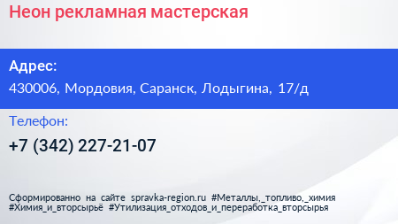 Неон, рекламная мастерская по адресу 430006, Мордовия, Саранск, Лодыгина, 17/д в дальнейшем Организация, размещена в следующих категориях: