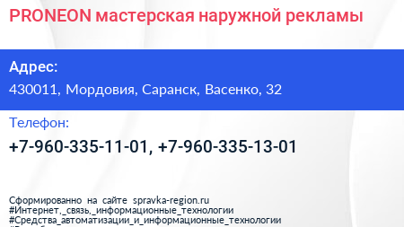 PRONEON, мастерская наружной рекламы по адресу 430011, Мордовия, Саранск, Васенко, 32 в дальнейшем Организация, размещена в следующих категориях: