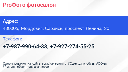 ProФото, фотосалон по адресу 430005, Мордовия, Саранск, проспект Ленина, 20 в дальнейшем Организация, размещена в следующих категориях: