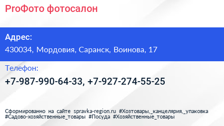 ProФото, фотосалон по адресу 430034, Мордовия, Саранск, Воинова, 17 в дальнейшем Организация, размещена в следующих категориях: