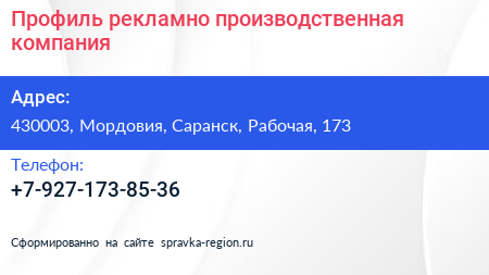Профиль, рекламно-производственная компания по адресу 430003, Мордовия, Саранск, Рабочая, 173 в дальнейшем Организация, размещена в следующих категориях: